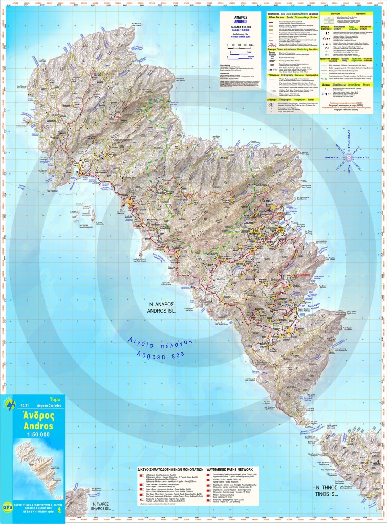 Greater Land Property very near to seaside (26500 sq.m.), on well slopped planes formatted in the traditional step-like levelize of soil (to make harvest work easier). It is ideally positioned on the middle area on the Westen side of Andros island – just 300m. from the coastline and 450m. from one of the most famous beach on the whole island – CHALKOLIMIONAS bay and beach – gathering crowds of visitors and swimming peopla , also featuring a beach-bar with 24hr. music cover. Overlooking the northwestern part of Aegean Sea and the sea-routes of the ferry-ships going to the nearest CYCLADES (Tinos – Mykonos – Paros – Naxos) and the opposite rocky island of GYAROS (a Monumental place for modern Greek History of Democracy), it also is favoured to have one of the most amazing overall View at Sundown (equal to the world famous of OIA at Santorini island), while another beach that is ideal for more quiet and privacy is in very short distance – APOTHIKES . All those qualities , together with the very fair proximity by car using the main road net of the island, ensure that it is ideal for every use : building a “palace-like” villa or more – a full Vacation Residential Project – a multi-purpose Hotel & Tourism Amenity Project Plan – even a Fun Park combined with Sea Park (number of swimming pools with games and sports).