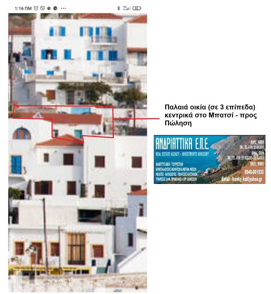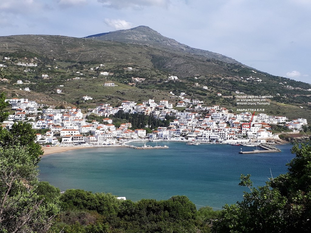 Plot (500 sq.m.) in the village – port of BATSI (Zone B’ – Building Permit 400 M2) and includes an old residence of 140 M2 (on 3 levels) With amazing view, centrally located (300M. from the coast and the Marina) . Located within a strongly sloping plot of the settlement of BATSI, adjacent to a municipal road (paveway). The residence needs some renovation but an extra building area is permitted to be added , after a legal Building Permit. Sale price : 300000 Eu.